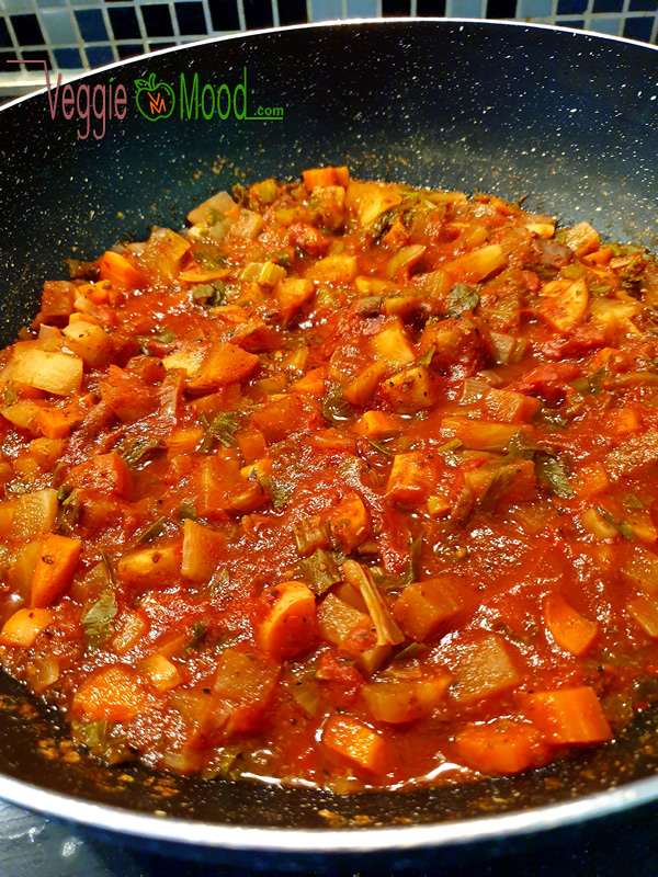 - Faire chauffer l’huile de coco dans un wok et y faire revenir l’oignon, les carottes, les topinambours et les champignons. Après environ 5 minutes ajouter l’origan bien mélanger et laisser 2 minutes de plus. Pour terminer ajouter les tomates pelées, le concentré de tomate et le bouillon de légumes. Couvrir et cuire 10 minutes. Rectifier l’assaisonnement.