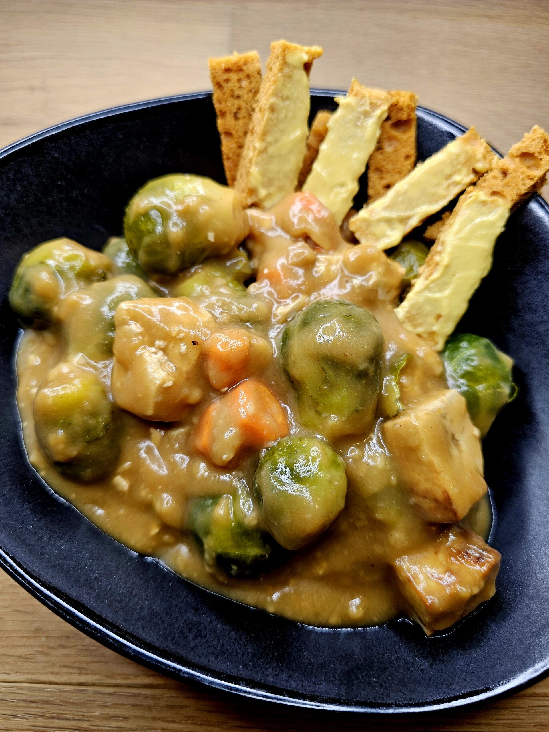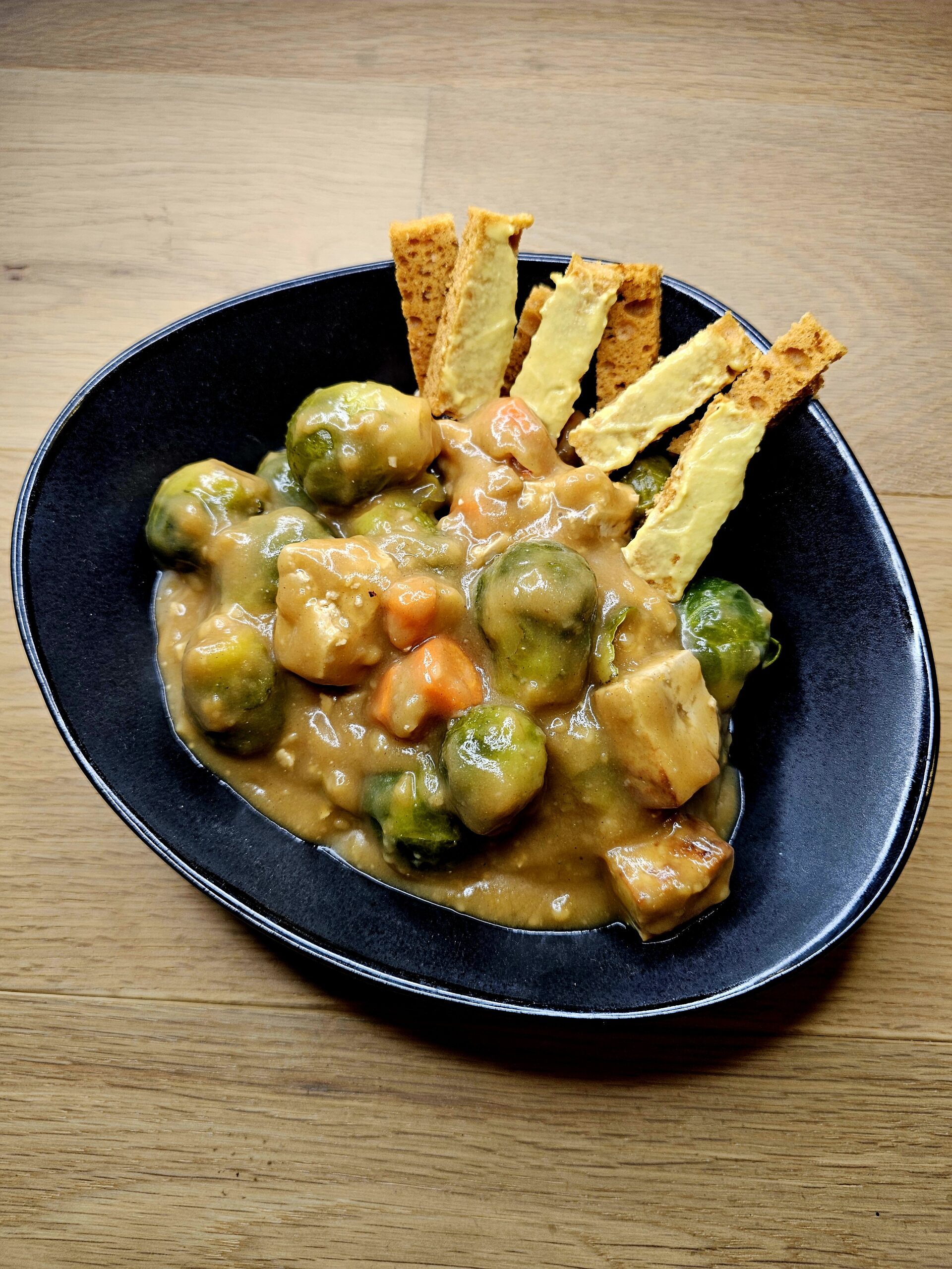 - Faire fondre la margarine et y faire dorer les choux de Bruxelles, les carottes et le tofu quelques minutes.