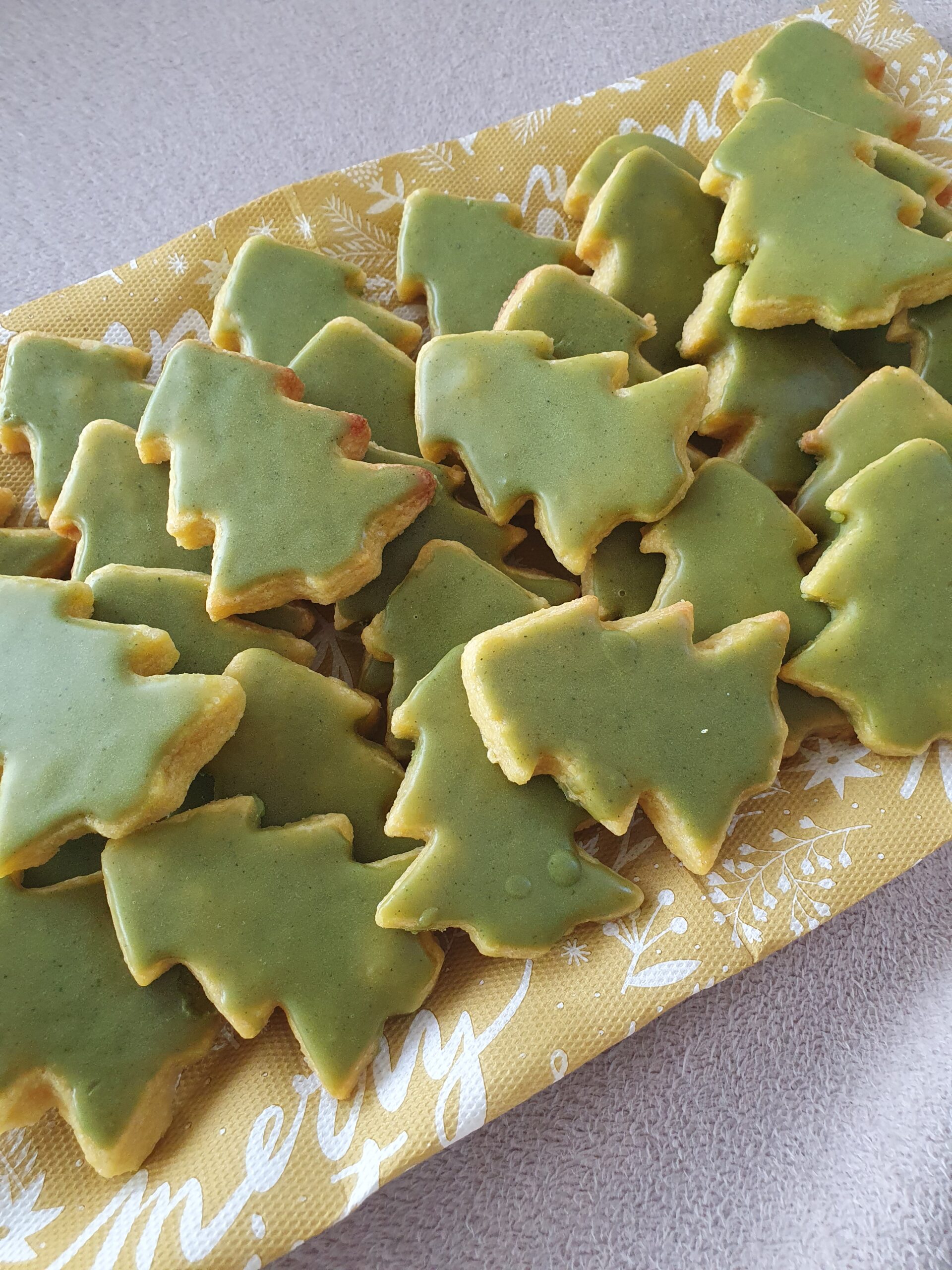 - Mélanger le sucre glace, le thé matcha et la boisson végétale à l’avoine. Deux ou trois cuillères, il ne faut pas que le mélanger soit trop liquide. Badigeonner les sapins et laisser sécher une à deux heures avant de placer les biscuits dans une boîte hermétique.